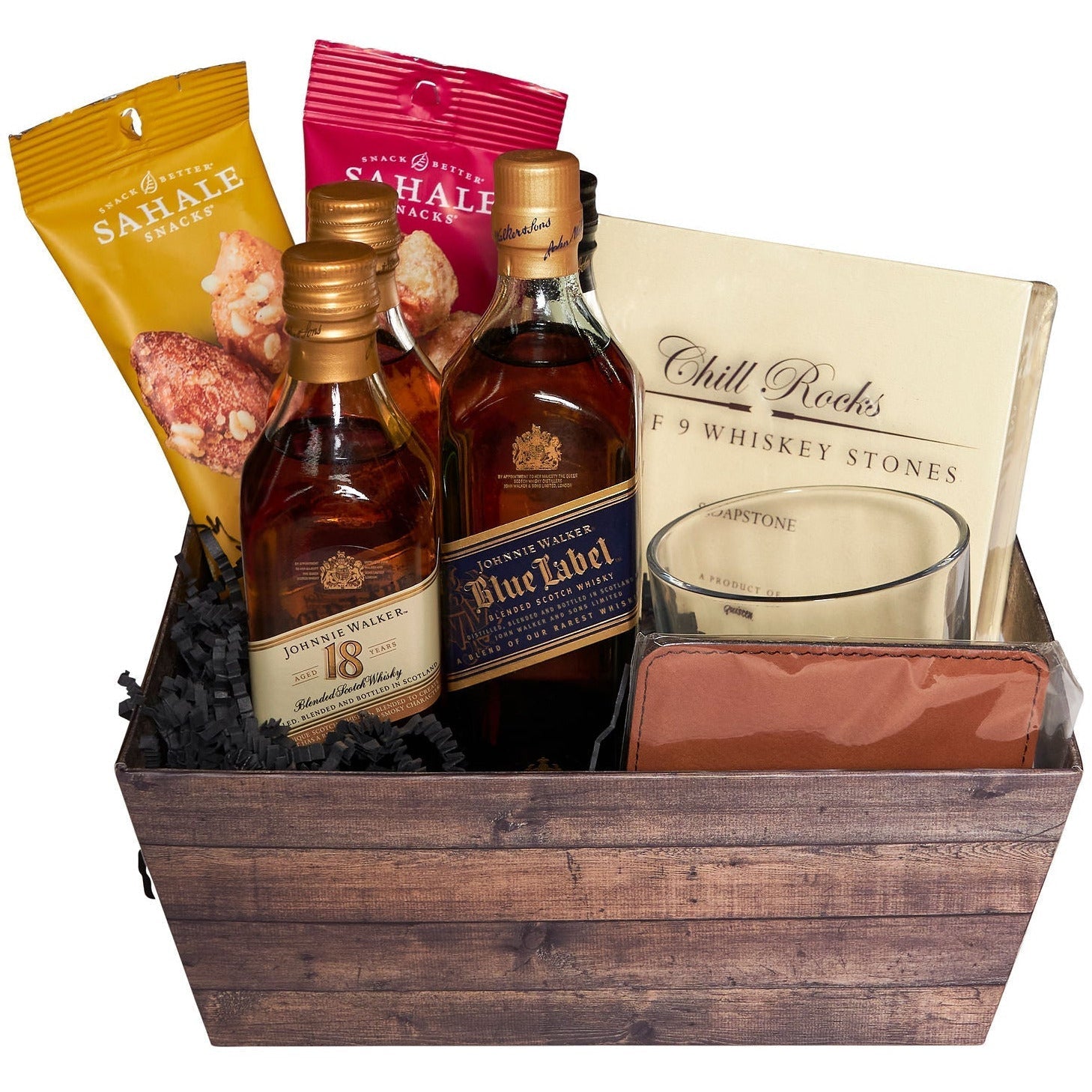 Elevate your scotch whisky experience with the Johnnie Walker Gift Set: The Exclusive Scotch Sampler, a premium collection featuring 200ml bottles of Johnnie Walker's most iconic labels. This luxurious gift basket includes the bold Black Label 12-Year, the silky Gold Reserve, the refined 18-Year-Old Scotch (also known as Platinum Label), and the rare, opulent Blue Label—offering a complete tour of rich, complex flavors and masterful blends that showcase Johnnie Walker's nearly 200-year legacy. The set comes beautifully presented with complementary accessories including a luxury leather coaster, a Waterford Crystal whiskey tumbler, whiskey chilling stones, and premium mixed nuts, making it the perfect gift for whisky connoisseurs and special occasions that demand extraordinary scotch.